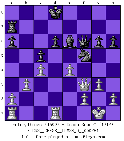 Last move : 1-0 2019 February 1 7:29:16 [Event "FICGS__CHESS__CLASS_D__000251"] [Site "FICGS"] [Date "2019.01.07"] [Round "1"] [White "Erler,Thomas"] [Black "Csoma,Robert"] [Result "1-0"] [WhiteElo "1600"] [BlackElo "1712"] 1.c4 d6 2.Nc3 c6 3.d4 b6 4.g3 a6 5.Bg2 h6 6.e3 g6 7.Nge2 f6 8.O-O e6 9.d5 c5 10.dxe6 Ra7 11.Bd5 Qe7 12.Nf4 Qg7 13.Qf3 Ne7 14.Ne4 Nxd5 15.Nxd5 Bxe6 16.Nexf6+ Kd8 17.Nxb6 Be7 18.Nbd5 Nc6 19.Nxe7 Nxe7 20.b3 Rf8 21.Bb2 Nf5 22.Rfd1 Rxf6 23.Bxf6+ Qxf6 24.e4 1-0 English Opening Kingside Castling by player White (move 8) Player White won this chess game. Follow this game move after move (download)You are for me the Queen on d8 and I am the Pawn on d7 !! (Eduard Gufeld) Ein Großmeister muß tausende Partien in seinem Kopf speichern, denn diese sind für Ihn, was die Worte der Muttersprache für gewöhnliche Leute sind, oder Noten für Musiker... (Garry Kasparov) Debes de llevar a tu oponente hacia un profundo y obscuro bosque donde 2+2=5, y el camino que conduce a la salida es suficientemente ancho para solamente uno. (Mikhail Tal) Si je n'étais pas joueur d'échecs, je serais le meilleur dans quelque chose d'autre. (Anatoli Karpov) Internet: Absolute communication, absolute isolation. (Paul Carvel)