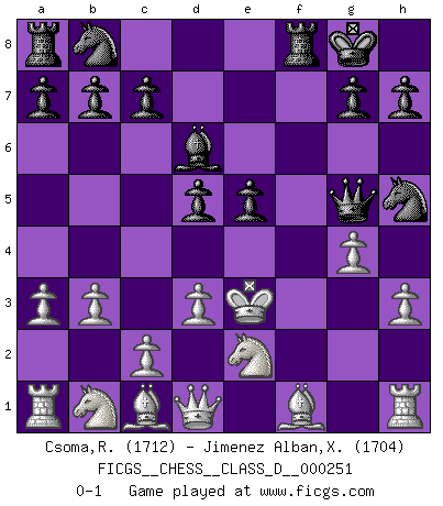 Last move : 0-1 2019 February 3 15:57:20 [Event "FICGS__CHESS__CLASS_D__000251"] [Site "FICGS"] [Date "2019.01.07"] [Round "1"] [White "Csoma,Robert"] [Black "Jimenez Alban,Xavier Miguel"] [Result "0-1"] [WhiteElo "1712"] [BlackElo "1704"] 1.d3 d5 2.e3 e5 3.f3 Bd6 4.g3 Nf6 5.h3 Nh5 6.Ne2 f5 7.a3 O-O 8.b3 f4 9.g4 Qh4+ 10.Kd2 fxe3+ 11.Kxe3 Bxg4 12.fxg4 Qg5+ 0-1 Mieses Opening Kingside Castling by player Black (move 7) Player Black won this chess game. Follow this game move after move (download)I'd rather have a Pawn than a finger. (Reuben Fine) Ich erzeugte keinen Neid, da mich die Schachspieler als Musiker und die Musiker als Schachspieler betrachteten. (Mark Taimanov) Todavía soy una víctima del Ajedrez. Tiene toda la belleza del arte y mucho mas. No puede ser comercializado. El Ajedrez es mas puro que el arte en su posición social. (Marcel Duchamp) L'attaque fait le spectacle, la défense gagne les matchs. (Dicton footballistique) There are more things in heaven and earth than practically anywhere else. (Unknown)