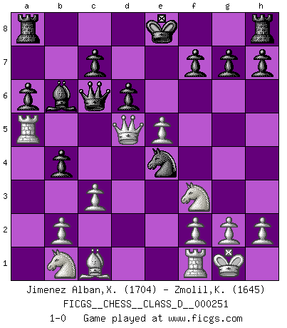 Last move : 1-0 2019 February 2 19:0:35 [Event "FICGS__CHESS__CLASS_D__000251"] [Site "FICGS"] [Date "2019.01.07"] [Round "1"] [White "Jimenez Alban,Xavier Miguel"] [Black "Zmolil,Karel"] [Result "1-0"] [WhiteElo "1704"] [BlackElo "1645"] 1.e4 e5 2.Nf3 Nc6 3.Bb5 a6 4.Ba4 Bc5 5.O-O b5 6.Bb3 d6 7.c3 Nf6 8.d4 Bb6 9.a4 b4 10.a5 Nxa5 11.Ba4+ Bd7 12.dxe5 Nxe4 13.Bxd7+ Qxd7 14.Qd5 Qc6 15.Rxa5 1-0 Ruy Lopez : Classical defense deferred Kingside Castling by player White (move 5) Player White won this chess game. Follow this game move after move (download)Alekhine is a poet who creates a work of art out of something that would hardly inspire another man to send home a picture post card. (Max Euwe) Die starken Figuren des Gegners muss man abtauschen. (José Raúl Capablanca) El Ajedrez, como la música, como el amor, tiene el poder de hacer feliz a la gente. (Siegbert Tarrasch) Tout change constamment, y compris dans le monde des Echecs. (Botvinnik) Perhaps the current trend of many chess professionals taking up the more lucrative pastime of poker is not a wholly negative one. It may not be too late for humans to relearn how to take risks in order to innovate and thereby maintain the advanced lifestyles we enjoy. And if it takes a poker-playing supercomputer to remind us that we can't enjoy the rewards without taking the risks, so be it. (The Chess Master and the Computer, by Garry Kasparov - 2010)