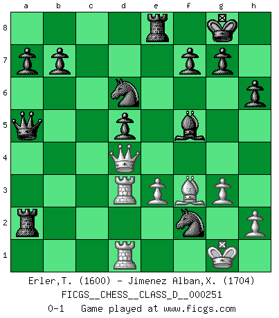 Last move : 0-1 2019 March 27 15:44:54 [Event "FICGS__CHESS__CLASS_D__000251"] [Site "FICGS"] [Date "2019.01.07"] [Round "1"] [White "Erler,Thomas"] [Black "Jimenez Alban,Xavier Miguel"] [Result "0-1"] [WhiteElo "1600"] [BlackElo "1704"] 1.c4 e5 2.Nc3 Nf6 3.g3 Bb4 4.Bg2 O-O 5.e3 Bxc3 6.bxc3 Nc6 7.Ne2 e4 8.Nf4 Ne5 9.d3 exd3 10.Nxd3 Nxc4 11.O-O d5 12.Nf4 c6 13.Re1 Re8 14.Rb1 Qa5 15.Qc2 h6 16.Bf3 Nd6 17.a4 Bf5 18.Nd3 c5 19.Qe2 c4 20.Rb4 cxd3 21.Qd2 Rac8 22.Ba3 Nfe4 23.Qb2 Rxc3 24.Rd4 Rxa3 25.Rd1 Rxa4 26.R4xd3 Ra2 27.Qd4 Nxf2 0-1 English : Bremen, Smyslov system Kingside Castling by player Black (move 4) Kingside Castling by player White (move 11) Player Black won this chess game. Follow this game move after move (download)Chess is no whit inferior to the violin, and we have a large number of professional violinists. (Mikhail Botvinnik) Gewöhnliche Menschen denken nur daran, wie sie ihre Zeit verbringen. Ein intelligenter Mensch versucht, sie auszunutzen. (Arthur Schopenhauer) Hoy en día, si tu no eres un Gran Maestro a los 14 años, es mejor que lo olvides. (Anand Viswanathan) Votre seul travail dans les ouvertures est d'obtenir un milieu de partie jouable. (Lajos Portish) Macintosh - we might not get everything right, but at least we knew the century was going to end. (Douglas Adams)