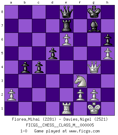 Last move : 1-0 2006 October 1 22:32:11 [Event "FICGS__CHESS__CLASS_M__000005"] [Site "FICGS"] [Date "2006.06.13"] [Round "1"] [White "Florea,Mihai"] [Black "Davies,Nigel"] [Result "1-0"] [WhiteElo "2281"] [BlackElo "2521"] 1.e4 e5 2.Nf3 Nc6 3.Bb5 Nf6 4.d3 d6 5.O-O Bd7 6.c3 g6 7.Nbd2 Bg7 8.Re1 O-O 9.Nf1 Qe8 10.Bg5 Kh8 11.Ne3 Rc8 12.Ba4 Ng8 13.Nd5 f5 14.Qb3 fxe4 15.dxe4 b6 16.Rad1 Nd4 17.Rxd4 exd4 18.Bxd7 Qxd7 19.cxd4 Rfe8 20.Nc3 c6 21.e5 d5 22.Ne2 c5 23.Nc3 h6 24.Bd2 Ne7 25.e6 Qc6 26.h4 a6 27.Ne2 a5 28.dxc5 bxc5 29.Nf4 Rb8 30.Qd3 Rxb2 31.Bc3 Rb4 32.Bxb4 axb4 33.Nxg6+ Kg8 34.h5 c4 35.Nxe7+ Rxe7 36.Qg6 Qe8 37.Qg4 1-0 Ruy Lopez : Berlin defense Kingside Castling by player White (move 5) Kingside Castling by player Black (move 8) Player White won this chess game. Follow this game move after move (download)For me, Chess is life and every game is like a new life. Every Chess player gets to live many lives in one lifetime. (Eduard Gufeld) Das Schachspiel ist ein See, in welchem eine Mücke baden und ein Elefant ertrinken kann. (Emanuel Lasker) Fischer era un maestro de claridad y un Rey del posicionamiento astuto. Sus oponentes podían ver hacia donde se dirigía pero eran impotentes para detenerlo. (Bruce Pandolfini) Le plus grand jeu de l'esprit jamais inventé, plus vous l'apprenez, plus vous y prenez du plaisir. (Garry Kasparov) Life is like internet, nothing interesting, but noone want to leave it. (Ilmars Cirulis)