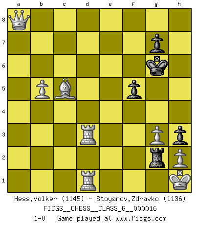 Last move : 1-0 2007 July 8 17:10:10 [Event "FICGS__CHESS__CLASS_G__000016"] [Site "FICGS"] [Date "2007.05.29"] [Round "1"] [White "Hess,Volker"] [Black "Stoyanov,Zdravko"] [Result "1-0"] [WhiteElo "1145"] [BlackElo "1136"] 1.c4 e5 2.Nc3 c6 3.g3 Qf6 4.Bg2 Bc5 5.Nf3 Ne7 6.O-O O-O 7.d3 h6 8.Ne4 Bxf2+ 9.Rxf2 Qe6 10.Rf1 Nf5 11.Bh3 Qg6 12.Bxf5 Qxf5 13.Nd6 Qe6 14.c5 b6 15.b4 Na6 16.a3 Nc7 17.Bb2 Ba6 18.Nxe5 f6 19.Ng6 Rfd8 20.Nf4 Qe3+ 21.Kg2 Nb5 22.Qb3+ Kh7 23.Nxb5 Bxb5 24.Qf7 Rf8 25.Qg6+ Kh8 26.Rf3 Qd2 27.Bd4 Rae8 28.Rf2 Re7 29.e4 Bxd3 30.Rxd2 Bxe4+ 31.Kg1 Bxg6 32.Nxg6+ Kh7 33.Nxf8+ Kg8 34.Ng6 Re4 35.cxb6 axb6 36.Bxb6 Rg4 37.Nf4 d5 38.Nxd5 cxd5 39.Rxd5 Kf7 40.Rad1 Kg6 41.Bc5 h5 42.a4 h4 43.R5d3 h3 44.a5 Re4 45.a6 Re2 46.a7 Ra2 47.b5 Rg2+ 48.Kh1 f5 49.a8Q 1-0 English Opening Kingside Castling by player White (move 6) Kingside Castling by player Black (move 6) Promotion Queen by player White (move 49) Player White won this chess game. Follow this game move after move (download)Those who say they understand Chess, understand nothing. (Robert Hubner) Das ganze Leben mit einer Ehefrau ist wie ein Endspiel mit ungleichfarbigen Läufern. (Viktor Kortschnoi) Botvinnik trató de alejar el misterio referente al Ajedrez, siempre relacionandolo a situaciones de la vida diaria. Solía llamar al Ajedrez un problema inexacto típico, similar a aquellos en que la gente tiene siempre que resolver a cada día. (Garry Kasparov) On est toujours la mazette de quelqu'un d'autre. (Anonyme) Now be brave and don't look back. Don't look back. (Shmi Skywalker in Star Wars ep.1)