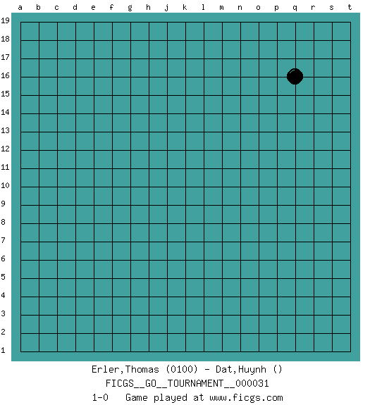 Last move : 1-0 2019 February 7 19:35:15 [Event "FICGS__GO__TOURNAMENT__000031"] [Site "FICGS"] [Date "2019.01.08"] [Round "1"] [Black "Erler,Thomas"] [White "Dat,Huynh"] [Result "1-0"] [Rating 1 "0100"] 1.q16 1-0 This go game has been lost on time (started : 2019.01.08 13:8:57) Here are the names of the openings (joseki) played in the four corners : Player Black won this Go (weiqi, baduk) game. Follow this game move after move (download)Conservative and slow will win. Believe it ! (Anonymous) In fact if nothing is done against this teddy bear, hereby I announce that I would quit chess, rapid chess, blitz chess, postal chess, email chess, server chess and correspondence chess I will then switch to a table game where teddy bears aren't going to be seen for a while, like Poker, or Roulette, all 18+ games. (Elmer Valderrama)