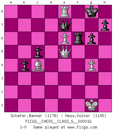 Last move : 1-0 2007 July 18 8:11:24 [Event "FICGS__CHESS__CLASS_G__000016"] [Site "FICGS"] [Date "2007.05.29"] [Round "1"] [White "Schafer,Banner"] [Black "Hess,Volker"] [Result "1-0"] [WhiteElo "1178"] [BlackElo "1145"] 1.d4 f5 2.Nf3 Nf6 3.c4 e6 4.Nc3 Be7 5.Bg5 O-O 6.e3 c6 7.Bd3 d5 8.O-O Qe8 9.Ne5 Nbd7 10.Bxf6 Bxf6 11.Nxd7 Bxd7 12.Ne2 Kh8 13.Nf4 dxc4 14.Bxc4 b5 15.Bb3 a5 16.a4 e5 17.dxe5 Bxe5 18.Rb1 b4 19.Re1 Rd8 20.Qf3 c5 21.h4 Bxa4 22.Bc4 Bc2 23.Ra1 Be4 24.Qe2 a4 25.Ne6 a3 26.Nxd8 Qxd8 27.Red1 Qxh4 28.f4 axb2 29.fxe5 bxa1Q 30.Rxa1 Qe7 31.e6 f4 32.exf4 Bf5 33.g4 Bg6 34.f5 Be8 35.Ra8 g6 36.Qe5+ Kg8 37.f6 Rxf6 38.Rxe8+ 1-0 Dutch Kingside Castling by player Black (move 5) Kingside Castling by player White (move 8) Promotion Queen by player Black (move 29) Player White won this chess game. Follow this game move after move (download)What is the object of playing a gambit opening?... To acquire a reputation of being a dashing player at the cost of losing a game. (Siegbert Tarrasch) Irgendwie scheint mir sonntags früh um 9 Uhr der Killerinstinkt verloren gegangen zu sein. (Alexej Shirov) La esencia del Ajedrez es pensar acerca de lo que el Ajedrez es. (David Bronstein) Dieu déplace le joueur, et celui-ci la pièce. Quel Dieu derrière Dieu commence donc la trame ? Arturo Perez-Reverte (prix de littérature policière 1993). Excelling at chess has long been considered a symbol of more general intelligence. That is an incorrect assumption in my view, as pleasant as it might be. But for the purposes of argument and investigation, chess is, in Russkin-Gutman's words, 'an unparalleled laboratory, since both the learning process and the degree of ability obtained can be objectified and quantified, providing an excellent comparative framework on which to use rigorous analytical techniques.' (The Chess Master and the Computer, by Garry Kasparov - 2010)