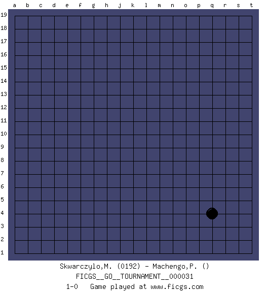Last move : 1-0 2019 February 7 19:35:15 [Event "FICGS__GO__TOURNAMENT__000031"] [Site "FICGS"] [Date "2019.01.08"] [Round "1"] [Black "Skwarczylo,Marek"] [White "Machengo,Prosper"] [Result "1-0"] [Rating 1 "0192"] 1.q4 1-0 This go game has been lost on time (started : 2019.01.08 13:8:57) Here are the names of the openings (joseki) played in the four corners : Corner q4 : q4 1-0 Hoshi (Hwajeom, Seongjeom, Xingwei`) 4-4 Point. The star or hoshi (4-4) point, emphasizing influence at the potential expense of territory. Player Black won this Go (weiqi, baduk) game. Follow this game move after move (download)Do not fear furikawari. (Anonymous) Rules and bones are meant to be broken. (Anonymous)