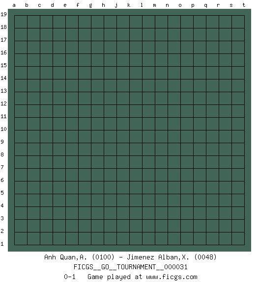 Last move : 0-1 2019 February 7 19:35:15 [Event "FICGS__GO__TOURNAMENT__000031"] [Site "FICGS"] [Date "2019.01.08"] [Round "1"] [Black "Anh Quan,An"] [White "Jimenez Alban,Xavier Miguel"] [Result "0-1"] [Rating 1 "0100"] [Rating 2 "0048"] 0-1 This go game has been lost on time (started : 2019.01.08 13:8:57) Here are the names of the openings (joseki) played in the four corners : Player White won this Go (weiqi, baduk) game. Follow this game move after move (download)Learn to play under the stones. (Anonymous) What doesn't kill us makes us stronger. (Friedrich Nietzsche)