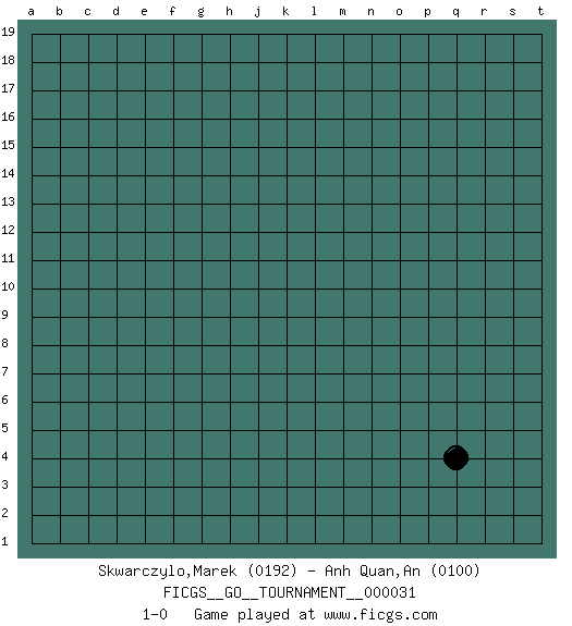 Last move : 1-0 2019 February 7 19:35:15 [Event "FICGS__GO__TOURNAMENT__000031"] [Site "FICGS"] [Date "2019.01.08"] [Round "1"] [Black "Skwarczylo,Marek"] [White "Anh Quan,An"] [Result "1-0"] [Rating 1 "0192"] [Rating 2 "0100"] 1.q4 1-0 This go game has been lost on time (started : 2019.01.08 13:8:57) Here are the names of the openings (joseki) played in the four corners : Corner q4 : q4 1-0 Hoshi (Hwajeom, Seongjeom, Xingwei`) 4-4 Point. The star or hoshi (4-4) point, emphasizing influence at the potential expense of territory. Player Black won this Go (weiqi, baduk) game. Follow this game move after move (download)It is difficult to know exactly what you are doing. (Pierre Audouard) Some people are so afraid to die that they never begin to live. (Henry Van Dyke)