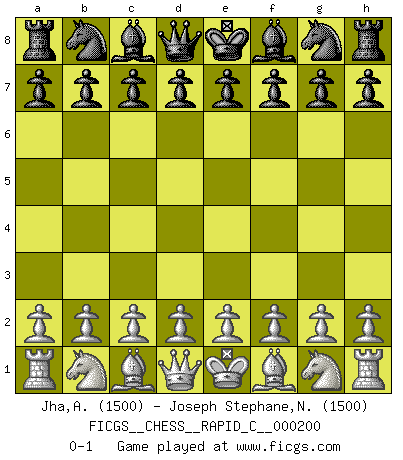 Last move : 0-1 2019 February 7 19:35:15 [Event "FICGS__CHESS__RAPID_C__000200"] [Site "FICGS"] [Date "2019.01.08"] [Round "1"] [White "Jha,Abhinav"] [Black "Joseph Stephane,Ngoma"] [Result "0-1"] [WhiteElo "1500"] [BlackElo "1500"] 0-1 This chess game has been lost on time (started : 2019.01.08 18:2:17) Player Black won this chess game. Follow this game move after move (download)Any material change in a position must come about by mate, a capture, or a Pawn promotion. (Purdy) Wenn ich einen Club besuche, sind die Spieler stumm vor Staunen. (José Raúl Capablanca) Combinaciones deslumbrantes son para la mayoría, mover madera es para los pocos. (Georg Kieninger) D'abord les bases : Jouez et étudiez, puis étudiez et jouez, ensuite jouez et étudiez, puis étudiez et jouez. Deuxièmement : Donnez toujours le meilleur de vous-même ! (Ken Smith) I know the human being and fish can coexist peacefully. (George W. Bush, Saginaw sept. 29, 2000)