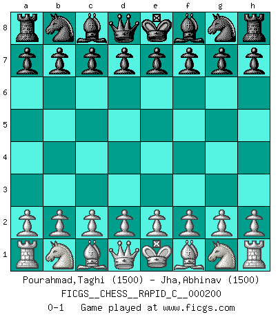 Last move : 0-1 2019 February 7 19:35:15 [Event "FICGS__CHESS__RAPID_C__000200"] [Site "FICGS"] [Date "2019.01.08"] [Round "1"] [White "Pourahmad,Taghi"] [Black "Jha,Abhinav"] [Result "0-1"] [WhiteElo "1500"] [BlackElo "1500"] 0-1 This chess game has been lost on time (started : 2019.01.08 18:2:17) Player Black won this chess game. Follow this game move after move (download)A bad plan is better than none at all. (Frank Marshall) Alles was am Schachbrett zählt sind gute Züge. (Robert James Fischer) Dios mío, Bobby Fischer juega tan simple. (Alexei Suetin) C'est la seule position que je connaisse où les deux camps sont mals. Propos prêtés à V. Anand. He who laughs last probably does not get the joke. (Unknown)