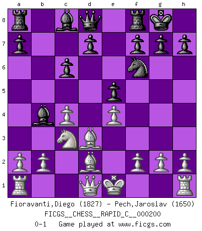 Last move : 0-1 2019 April 26 18:36:14 [Event "FICGS__CHESS__RAPID_C__000200"] [Site "FICGS"] [Date "2019.01.08"] [Round "1"] [White "Fioravanti,Diego"] [Black "Pech,Jaroslav"] [Result "0-1"] [WhiteElo "1827"] [BlackElo "1650"] 1.Nf3 Nf6 2.c4 c5 3.d4 cxd4 4.Nxd4 Nc6 5.Nc3 e6 6.e4 Bb4 7.Nxc6 bxc6 8.Bd3 e5 9.Bd2 O-O 0-1 This chess game has been lost on time (started : 2019.01.08 18:2:17) Reti Opening Kingside Castling by player Black (move 9) Player Black won this chess game. Follow this game move after move (download)My opponents make good moves too. Sometimes I don't take these things into consideration. (Bobby Fischer) In der Schule lernt man nichts. Es ist nur Zeitverschwendung. (Robert James Fischer) Combinaciones deslumbrantes son para la mayoría, mover madera es para los pocos. (Georg Kieninger) Les échecs sont utiles à l'exercice de la faculté de penser et à celle de l'imagination. Car nous devons posséder une méthode élaborée pour atteindre des buts partout où nous devons conduire notre raison. (Leibnitz) History is a gallery of pictures in which there are few originals and many copies. (Alexis de Tocqueville)