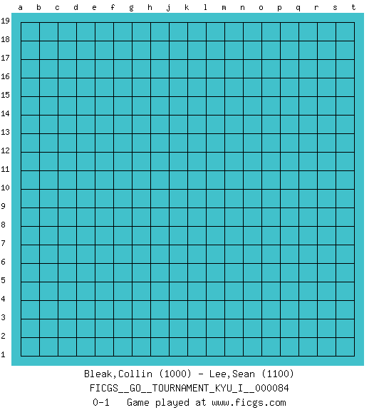 Last move : 0-1 2019 February 8 19:36:38 [Event "FICGS__GO__TOURNAMENT_KYU_I__000084"] [Site "FICGS"] [Date "2019.01.09"] [Round "1"] [Black "Bleak,Collin"] [White "Lee,Sean"] [Result "0-1"] [Rating 1 "1000"] [Rating 2 "1100"] 0-1 This go game has been lost on time (started : 2019.01.09 8:59:17) Here are the names of the openings (joseki) played in the four corners : Player White won this Go (weiqi, baduk) game. Follow this game move after move (download)White is always trying to kill a bigger group than black is trying to save. (Anonymous) May the force be with you. (Han Solo in Star Wars ep.4)