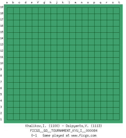 Last move : 0-1 2019 February 8 19:36:38 [Event "FICGS__GO__TOURNAMENT_KYU_I__000084"] [Site "FICGS"] [Date "2019.01.09"] [Round "1"] [Black "Khalikov,Ilyas"] [White "Osipyants,Vladimir"] [Result "0-1"] [Rating 1 "1100"] [Rating 2 "1113"] 0-1 This go game has been lost on time (started : 2019.01.09 8:59:17) Here are the names of the openings (joseki) played in the four corners : Player White won this Go (weiqi, baduk) game. Follow this game move after move (download)One point in the center is worth ten in the corner. (Anonymous) Wipe them out. All of them. (Darth Sidious in Star Wars ep.1)