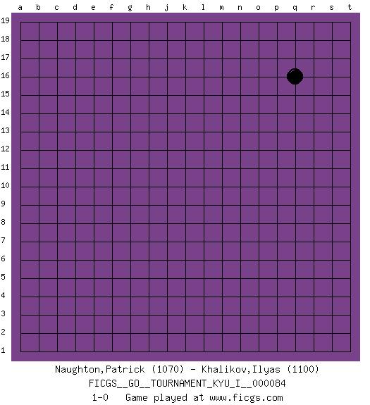 Last move : 1-0 2019 February 8 19:36:38 [Event "FICGS__GO__TOURNAMENT_KYU_I__000084"] [Site "FICGS"] [Date "2019.01.09"] [Round "1"] [Black "Naughton,Patrick"] [White "Khalikov,Ilyas"] [Result "1-0"] [Rating 1 "1070"] [Rating 2 "1100"] 1.q16 1-0 This go game has been lost on time (started : 2019.01.09 8:59:17) Here are the names of the openings (joseki) played in the four corners : Player Black won this Go (weiqi, baduk) game. Follow this game move after move (download)The carpenter's square becomes ko. (Anonymous) Do you know these so called Volunteers don't even get paid! (Simpsons)