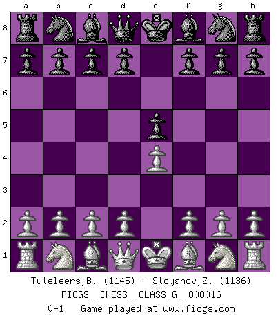 Last move : 0-1 2007 July 13 4:45:38 [Event "FICGS__CHESS__CLASS_G__000016"] [Site "FICGS"] [Date "2007.05.29"] [Round "1"] [White "Tuteleers,Bruno"] [Black "Stoyanov,Zdravko"] [Result "0-1"] [WhiteElo "1145"] [BlackElo "1136"] 1.e4 e5 0-1 This chess game has been lost on time (started : 2007.05.29 4:43:35) King's pawn game Player Black won this chess game. Follow this game move after move (download)An attack on the wing should be met by play in the center. (Nimzovitch) Je mehr wir mit Computern analysieren, desto mehr glauben wir an Verteidigung. (Vladimir Kramnik) Los problemas de Ajedrez exigen del compositor las mismas virtudes que caracterizan todo el arte de valor: originalidad, invención, concisión, armonía, complejidad e insinceridad explendida. (Vladimir Nabokov) Les Echecs sont affaire de jugement sensible. Savoir quand frapper et quand esquiver. (Fischer) A good teacher is like a candle - it consumes itself to light the way for others. (Author unknown)