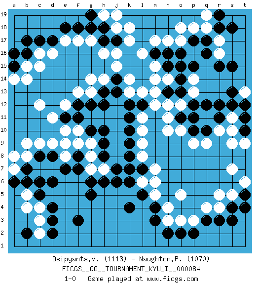 Last move : 1-0 2019 January 26 0:27:3 [Event "FICGS__GO__TOURNAMENT_KYU_I__000084"] [Site "FICGS"] [Date "2019.01.09"] [Round "1"] [Black "Osipyants,Vladimir"] [White "Naughton,Patrick"] [Result "1-0"] [Rating 1 "1113"] [Rating 2 "1070"] 1.q16 d16 2.d4 q4 3.c6 o17 4.m16 m17 5.n16 n17 6.o16 l16 7.p17 k17 8.q10 r10 9.r11 q11 10.r12 q9 11.p10 s10 12.p11 p9 13.r3 r4 14.q3 p3 15.p2 o3 16.o2 n3 17.f3 c9 18.c17 c16 19.d17 e17 20.e18 f17 21.f18 c12 22.k4 m13 23.o14 m15 24.n15 m14 25.h10 g9 26.k10 n10 27.h9 g8 28.h8 g7 29.j6 g13 30.j13 g14 31.g10 f10 32.g5 m6 33.m4 n4 34.m3 m5 35.f11 e10 36.e11 d11 37.g12 e12 38.h13 h14 39.j14 j15 40.e7 e8 41.f7 k14 42.f8 f9 43.d8 d9 44.c8 b8 45.b7 b9 46.g6 h7 47.j7 r16 48.r15 r17 49.q17 q19 50.r18 q18 51.s18 p18 52.s15 n14 53.o13 l8 54.s4 s5 55.s3 r5 56.n2 o5 57.b16 b15 58.b17 c15 59.g18 g17 60.h18 k18 61.h17 h16 62.l5 t13 63.s13 o10 64.o11 n11 65.t12 s11 66.s12 c3 67.d3 c4 68.c5 b5 69.b6 b4 70.b2 c2 71.d2 k13 72.k12 l6 73.k6 l10 74.k9 l9 75.l12 m12 76.k11 l13 77.t5 t6 78.t4 s7 79.k8 o12 80.p12 n12 81.p15 l11 82.t11 s9 83.t10 t9 84.a15 a14 85.a16 b14 86.r19 o18 87.j17 j16 88.f12 f13 89.h12 e9 90.h6 j18 91.l7 m7 92.k7 a7 93.a6 a8 94.d6 h19 95.g19 j19 96.n13 p13 97.q12 p14 98.o15 pass 99.pass 1-0 Here are the names of the openings (joseki) played in the four corners : Corner q16 : q16 o17 Hoshi (Hwajeom, Seongjeom, Xingwei`) 4-4 Point. The star or hoshi (4-4) point, emphasizing influence at the potential expense of territory. Ikken Kakari (Hankan Keolch'im, Yi Gua`jiao~, 1-Space Low Approach). White 2 is the standard approach move to the 4-4. Corner d16 : d16 c17 Hoshi (Hwajeom, Seongjeom, Xingwei`) 4-4 Point. The star or hoshi (4-4) point, emphasizing influence at the potential expense of territory. Player Black won this Go (weiqi, baduk) game. Follow this game move after move (download)With only one group, you will win. (Anonymous) Inventor: A person who makes an ingenious arrangement of wheels, levers and springs, and believes it civilization. (Ambrose Bierce, The Devil's Dictionary)