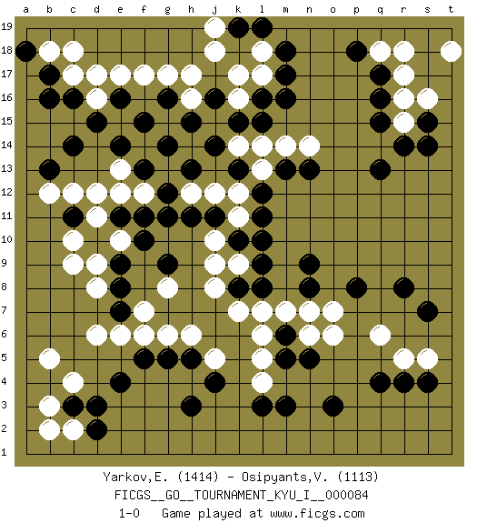Last move : 1-0 2019 January 31 17:27:55 [Event "FICGS__GO__TOURNAMENT_KYU_I__000084"] [Site "FICGS"] [Date "2019.01.09"] [Round "1"] [Black "Yarkov,Evgeny"] [White "Osipyants,Vladimir"] [Result "1-0"] [Rating 1 "1414"] [Rating 2 "1113"] 1.q16 d16 2.q4 c4 3.e4 d6 4.c3 b3 5.d3 b5 6.h3 l4 7.o3 q6 8.r8 r5 9.r4 o6 10.p8 o7 11.n9 l7 12.q13 k16 13.c14 f17 14.b16 c17 15.c11 c9 16.n5 n6 17.m5 l5 18.m6 m7 19.n8 n7 20.l9 l6 21.m17 l17 22.m16 h6 23.k15 h16 24.l16 k17 25.h15 r17 26.q17 r16 27.r14 r15 28.q15 q18 29.p18 r18 30.s15 s16 31.g16 h17 32.m3 j9 33.l3 k11 34.l11 k12 35.l12 e10 36.d15 e15 37.e14 j15 38.j14 k14 39.j16 l13 40.e16 e17 41.f15 g17 42.m13 m14 43.n13 n14 44.l15 l14 45.k10 j10 46.j11 j12 47.h11 h12 48.g11 f12 49.f11 e12 50.e11 d12 51.g12 g13 52.h13 d11 53.k13 c12 54.j4 j5 55.g9 f7 56.b13 b12 57.s14 t18 58.g5 g6 59.b17 b18 60.c16 d17 61.a18 c18 62.s4 s5 63.s7 c2 64.d2 b2 65.e9 d9 66.f10 c10 67.e8 d8 68.e7 e6 69.f5 g8 70.h5 k9 71.l10 f6 72.k8 j8 73.l8 k7 74.m18 l18 75.l19 j18 76.k19 j19 77.f13 e13 78.g14 1-0 Here are the names of the openings (joseki) played in the four corners : Corner d4 : c4 e4 Komoku (Somok, Xiao~mu`) 3-4 Point. The komoku (3-4) point is the traditional corner enclosure move.. Ikken Takagakari (Hankan Nop'dakeolch'im, Yi Gaogua`jiao~, 1-Space High Approach). The 5-4 approach move has become more popular in modern times, as modern Go emphasizes speed and influence. Corner q4 : q4 l4 Hoshi (Hwajeom, Seongjeom, Xingwei`) 4-4 Point. The star or hoshi (4-4) point, emphasizing influence at the potential expense of territory. Corner d16 : d16 c14 Hoshi (Hwajeom, Seongjeom, Xingwei`) 4-4 Point. The star or hoshi (4-4) point, emphasizing influence at the potential expense of territory. Ikken Kakari (Hankan Keolch'im, Yi Gua`jiao~, 1-Space Low Approach). Black 2 is the standard approach move to the 4-4. Player Black won this Go (weiqi, baduk) game. Follow this game move after move (download)Go uses the most elemental materials and concepts - line and circle, wood and stone, black and white - combining them with simple rules to generate subtle strategies and complex tactics that stagger the imagination. (Iwamoto Kaoru, 9 dan professional Go player and former Honinbo title holder) When a man with money meets a man with experience, the man with experience leaves with money and the man with money leaves with experience. (Anonymous)