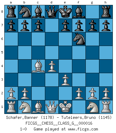 Last move : 1-0 2007 July 10 16:36:57 [Event "FICGS__CHESS__CLASS_G__000016"] [Site "FICGS"] [Date "2007.05.29"] [Round "1"] [White "Schafer,Banner"] [Black "Tuteleers,Bruno"] [Result "1-0"] [WhiteElo "1178"] [BlackElo "1145"] 1.d4 d5 2.c4 dxc4 3.e3 Nf6 4.Bxc4 1-0 This chess game has been lost on time (started : 2007.05.29 4:43:35) Queen's gambit accepted Player White won this chess game. Follow this game move after move (download)With or without the title, Bobby Fischer was unquestionably the greatest player of his time. (Burt Hochberg) Als ich elf wurde, wurde ich einfach gut. (Robert James Fischer) El Ajedrez, como la música, como el amor, tiene el poder de hacer feliz a la gente. (Siegbert Tarrasch) J'ai toujours senti une vague pitié pour l'homme qui ne connaît rien aux échecs, tout comme j'en aurais pour un homme ignorant de l'amour. Les Echecs, comme la musique ou comme l'amour, ont le pouvoir de rendre heureux. (Siegbert Tarrasch) I believe in luck. How else can you explain the success of those you dislike ? (Jean Cocteau)