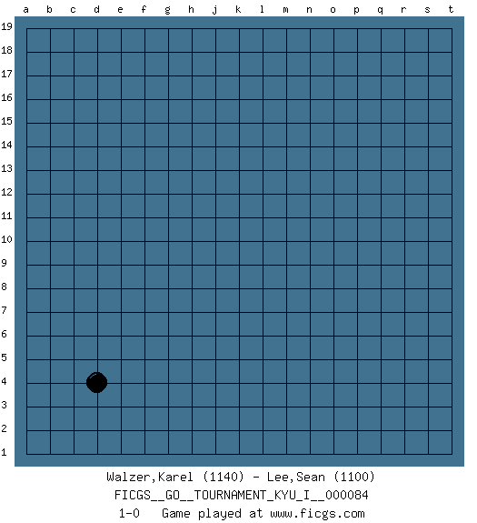 Last move : 1-0 2019 February 9 7:41:20 [Event "FICGS__GO__TOURNAMENT_KYU_I__000084"] [Site "FICGS"] [Date "2019.01.09"] [Round "1"] [Black "Walzer,Karel"] [White "Lee,Sean"] [Result "1-0"] [Rating 1 "1140"] [Rating 2 "1100"] 1.d4 1-0 This go game has been lost on time (started : 2019.01.09 8:59:17) Here are the names of the openings (joseki) played in the four corners : Corner d4 : d4 1-0 Hoshi (Hwajeom, Seongjeom, Xingwei`) 4-4 Point. The star or hoshi (4-4) point, emphasizing influence at the potential expense of territory. Player Black won this Go (weiqi, baduk) game. Follow this game move after move (download)Conservative and slow will win. Believe it ! (Anonymous) Either move or be moved. (Ezra Pound)