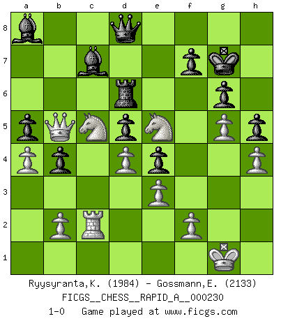Last move : 1-0 2019 April 23 14:23:52 [Event "FICGS__CHESS__RAPID_A__000230"] [Site "FICGS"] [Date "2019.01.12"] [Round "1"] [White "Ryysyranta,Kaaleppi"] [Black "Gossmann,Ewald"] [Result "1-0"] [WhiteElo "1984"] [BlackElo "2133"] 1.d4 Nf6 2.Bg5 d5 3.Bxf6 exf6 4.e3 Bd6 5.g3 O-O 6.Bg2 c6 7.Ne2 Nd7 8.O-O f5 9.Nd2 b5 10.c3 Nf6 11.a4 b4 12.c4 Ne4 13.Re1 Ba6 14.cxd5 cxd5 15.Nf4 Bb7 16.Nb3 a5 17.Nd3 Rc8 18.Rc1 Rxc1 19.Qxc1 g6 20.Ndc5 Ba8 21.Qc2 Kg7 22.Qd3 Bc7 23.Bxe4 fxe4 24.Qb5 Re8 25.Nd7 h5 26.Rc1 Re6 27.h4 Kh6 28.Ne5 Rf6 29.Rc5 Bb6 30.Rc1 Bc7 31.Rc5 Bb6 32.g4 Kg7 33.g5 Rd6 34.Rc2 Bc7 35.Nc5 1-0 Trompowsky attack (Ruth, Opovcensky Opening) Kingside Castling by player Black (move 5) Kingside Castling by player White (move 8) Player White won this chess game. Follow this game move after move (download)A Chess game is a dialogue, a conversation between a player and his opponent. Each move by the opponent may contain threats or be a blunder, but a player cannot defend against threats or take advantage of blunders if he does not first ask himself: What is my opponent planning after each move ? (Bruce A. Moon) Meine Liebe ist Schach, Schach, Schach. Ich muss jeden Tag Schach spielen, deshalb fühle ich mich so stark. (Miguel Najdorf) Sin errores no puede haber brillantez. (Emanuel Lasker) Vous savez, camarade Pachman, je n'éprouve pas de plaisir à être ministre, je jouerais plutôt aux échecs comme vous, ou alors ferais une révolution au Venezuela. (Che Guevara à Ludek Pachman, 'Checkmate in Prague', 1975) Creativity is allowing yourself to make mistakes. Art is knowing which ones to keep. (Scott Adams)