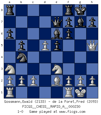 Last move : 1-0 2019 March 2 7:44:23 [Event "FICGS__CHESS__RAPID_A__000230"] [Site "FICGS"] [Date "2019.01.12"] [Round "1"] [White "Gossmann,Ewald"] [Black "de la Foret,Fred"] [Result "1-0"] [WhiteElo "2133"] [BlackElo "2093"] 1.e4 c5 2.Nf3 Nc6 3.d4 cxd4 4.Nxd4 Nf6 5.Nc3 e5 6.Ndb5 d6 7.Bg5 a6 8.Na3 b5 9.Bxf6 gxf6 10.Nd5 Bg7 11.Bd3 Be6 12.Ne3 O-O 13.Qh5 Nb4 14.Be2 Qe7 15.O-O d5 16.exd5 1-0 Sicilian : Pelikan (Lasker/Sveshnikov) variation Kingside Castling by player Black (move 12) Kingside Castling by player White (move 15) Player White won this chess game. Follow this game move after move (download)Chess opens and enriches your mind. (Saudin Robovic) Zeige mir drei Eröffnungsvarianten und ich beweise dir, dass zwei davon inkorrekt sind. (Emanuel Lasker) Después de una mala apertura, hay una esperanza en el juego medio. Pero una vez que estas en finales, el momento de la verdad ha llegado. (Edmar Mednis) Si le désir cupide (et stupide) de gagner est une inépuisable source de souffrance, une combinaison brillante sur l'échiquier est une découverte : le coquelicot qui s'épanouit lorsque apparaît la Voie Lactée. (Arrabal) The faster the computer, the slower the brain. (Thibault de Vassal)