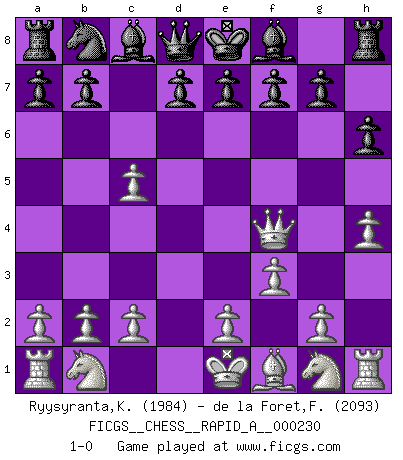 Last move : 1-0 2019 March 12 13:25:51 [Event "FICGS__CHESS__RAPID_A__000230"] [Site "FICGS"] [Date "2019.01.12"] [Round "1"] [White "Ryysyranta,Kaaleppi"] [Black "de la Foret,Fred"] [Result "1-0"] [WhiteElo "1984"] [BlackElo "2093"] 1.d4 Nf6 2.Bg5 Ne4 3.h4 h6 4.Bf4 c5 5.f3 Nf6 6.dxc5 Nh5 7.Qd2 Nxf4 8.Qxf4 1-0 Trompowsky attack (Ruth, Opovcensky Opening) Player White won this chess game. Follow this game move after move (download)Fischer Chess play was always razor-sharp, rational and brilliant. One of the best ever. (Dave Regis) Konzentriere dich auf materielle Gewinne. Nimm, was dir dein Gegner gibt, ausser es gibt einen guten Grund der dagegenspricht. (Robert James Fischer) El jugador de combinación piensa hacia adelante; comienza de la posición dada y trabaja las movidas contundentes en su mente. (Emanuel Lasker) La guerre est enfant de la passion, la passion est enfant du narcissisme et le narcissisme est l'enfant. (...) Une autre partie ? (Thibault de Vassal) A good player is always lucky. (Capablanca)