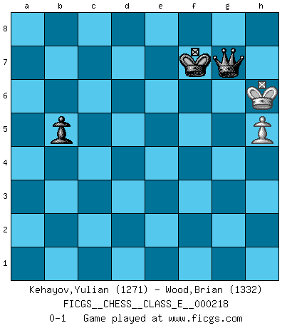 Last move : 0-1 2019 May 12 10:6:21 [Event "FICGS__CHESS__CLASS_E__000218"] [Site "FICGS"] [Date "2019.01.12"] [Round "1"] [White "Kehayov,Yulian"] [Black "Wood,Brian"] [Result "0-1"] [WhiteElo "1271"] [BlackElo "1332"] 1.d4 d5 2.e3 Nf6 3.Nc3 Bf5 4.Nf3 Ne4 5.Nxe4 Bxe4 6.Bd3 e6 7.O-O Nc6 8.Bxe4 dxe4 9.Nd2 Be7 10.c4 O-O 11.c5 f5 12.h3 e5 13.Nb3 exd4 14.exd4 Bg5 15.Be3 Bxe3 16.fxe3 b6 17.g4 fxg4 18.Qxg4 Rxf1+ 19.Rxf1 bxc5 20.Nxc5 Nxd4 21.exd4 Qxd4+ 22.Rf2 Qxc5 23.Qxe4 Rf8 24.Qe2 Rxf2 25.Qxf2 Qxf2+ 26.Kxf2 g5 27.Kg3 h5 28.h4 g4 29.b4 a6 30.a4 c6 31.Kf4 Kf7 32.b5 cxb5 33.axb5 axb5 34.Kg5 g3 35.Kxh5 g2 36.Kh6 g1Q 37.h5 Qg7+ 0-1 Queen's pawn game Kingside Castling by player White (move 7) Kingside Castling by player Black (move 10) 10 pieces endgame at move 25 : White KPPP , Black KQPPPP WHITE : King + 3 Pawns BLACK : King + 1 Queen 4 Pawns 9 pieces endgame at move 26 : White KPPP , Black KPPPP WHITE : King + 3 Pawns BLACK : King + 4 Pawns 8 pieces endgame at move 32 : White KPP , Black KPPPP WHITE : King + 2 Pawns BLACK : King + 4 Pawns 7 pieces endgame at move 33 : White KPP , Black KPPP WHITE : King + 2 Pawns BLACK : King + 3 Pawns 6 pieces endgame at move 33 : White KP , Black KPPP WHITE : King + 1 Pawn BLACK : King + 3 Pawns 5 pieces endgame at move 35 : White KP , Black KPP WHITE : King + 1 Pawn BLACK : King + 2 Pawns Promotion Queen by player Black (move 36) Player Black won this chess game. Follow this game move after move (download)What would Chess be without silly mistakes ? (Kurt Richter) Die Jungen erwarten, dass Opa einfach umfällt. Dann aber kann Opa fünf Stunden lang Schach spielen und die jungen Gegner an die Wand drücken. (Viktor Kortschnoi) Mis oponentes también hacen buenas movidas. A veces yo no tomo esas cosas en consideración. (Bobby Fischer) Vous n'êtes pas toujours obligé de jouer le meilleur coup. Un coup doit être actif, entreprenant, correct et beau ! (David Bronstein) Opportunities multiply as they are seized. (Sun Tzu)