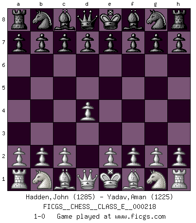 Last move : 1-0 2019 February 21 21:2:46 [Event "FICGS__CHESS__CLASS_E__000218"] [Site "FICGS"] [Date "2019.01.12"] [Round "1"] [White "Hadden,John"] [Black "Yadav,Aman"] [Result "1-0"] [WhiteElo "1285"] [BlackElo "1225"] 1.d4 1-0 This chess game has been lost on time (started : 2019.01.12 17:49:49) Queen's pawn Player White won this chess game. Follow this game move after move (download)The beauty of a move lies not in its' appearance but in the thought behind it. (Siegbert Tarrasch) Es ist peinlich, dass ich nie Weltmeister wurde. Es wäre leicht, Leonid Breschnjew als Ursache vorzuschieben, dessen Apparat den Vorzeigekommunisten Anatoli Karpow in allem unterstützte. Aber Garri Kasparow zum Beispiel, der ebenfalls von den Sowjets unerwünscht war, hat trotz der Widerstände den WM-Titel erobert. (Viktor Kortschnoi) El Ajedrez es de 30 a 40 por ciento psicología. Uno no cuenta con esto cuando se juega contra una computadora. No lo puedo confundir. (Judith Polgar) Les Echecs représentent une sphère d'idées créatrices basée sur la volonté des deux protagonistes. (Smyslov) A specialist learns more and more about less and less until he knows everything about nothing. (Nicholas Murray Butler)