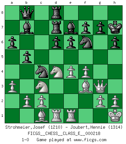 Last move : 1-0 2019 February 27 21:14:30 [Event "FICGS__CHESS__CLASS_E__000218"] [Site "FICGS"] [Date "2019.01.12"] [Round "1"] [White "Strohmeier,Josef"] [Black "Joubert,Hennie"] [Result "1-0"] [WhiteElo "1210"] [BlackElo "1314"] 1.e4 c5 2.Nf3 e6 3.d4 cxd4 4.Nxd4 Nf6 5.Nc3 Qb6 6.Nb3 Nc6 7.Be3 Qc7 8.Be2 a6 9.O-O d6 10.f4 Be7 11.Qd2 b5 12.a3 Bb7 13.Bf3 O-O 14.Rad1 Rad8 15.Qf2 Qb8 16.Bb6 Rd7 17.Rfe1 h6 18.Be3 Rfd8 19.Qg3 Kh7 20.Nd4 Na5 21.Kh1 Nc4 22.Bc1 1-0 Sicilian : Anderssen variation Kingside Castling by player White (move 9) Kingside Castling by player Black (move 13) Player White won this chess game. Follow this game move after move (download)Methodical thinking is of more use in Chess than inspiration. (C. J. S. Purdy) Ein Schachspiel besteht aus drei Phasen: Die erste, wenn du hofftst den Vorteil zu haben, die zweite, wenn du glaubst einen Vorteil zu haben, und die dritte.... wenn du weißt Du wirst verlieren. (Savielly Grigorievitsch Tartakower) a manera como él juega al Ajedrez, demuestra la completa naturaleza de un hombre. (Stanley Ellin) Les échecs sont plus proches de l'art de l'assassinat que de l'art de la guerre. (Arturo Perez-Reverte) Happy endings are just stories that haven't finished yet. (Jane Smith in Mr & Mrs Smith)