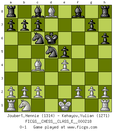 Last move : 0-1 2019 February 9 10:47:1 [Event "FICGS__CHESS__CLASS_E__000218"] [Site "FICGS"] [Date "2019.01.12"] [Round "1"] [White "Joubert,Hennie"] [Black "Kehayov,Yulian"] [Result "0-1"] [WhiteElo "1314"] [BlackElo "1271"] 1.e4 e5 2.Nf3 d6 3.Bc4 h6 4.d4 f6 5.dxe5 fxe5 6.Nxe5 dxe5 7.Qh5+ Ke7 8.Bg5+ Nf6 9.Qf7+ Kd6 10.Qd5+ Nxd5 11.Bxd8 Nc6 0-1 Philidor's defense Player Black won this chess game. Follow this game move after move (download)A great player and a great example for many. His book My 60 Memorable Games had a big impact on me. It is a shame he didn't continue to enrich the world of chess with his unparalleled understanding after 1972. (Jan Timman, about Bobby Fischer's death) Das Zentrum ist der Balkan des Schachbretts - Kriegshandlungen können in jedem Moment ausbrechen. (Aaron Nimzowitsch) La vida es como el Ajedrez, con lucha, competición y eventos buenos y malos. (Benjamin Franklin) A chaque perte on perd un peu de soi. (Joël Lautier) To err is human, but to really foul things up requires a computer. (Farmer's Almanac, 1978)