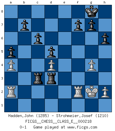 Last move : 0-1 2019 March 23 20:30:30 [Event "FICGS__CHESS__CLASS_E__000218"] [Site "FICGS"] [Date "2019.01.12"] [Round "1"] [White "Hadden,John"] [Black "Strohmeier,Josef"] [Result "0-1"] [WhiteElo "1285"] [BlackElo "1210"] 1.d4 d5 2.c4 e6 3.cxd5 exd5 4.Nf3 Nf6 5.Nc3 Bb4 6.a3 Bxc3+ 7.bxc3 Ne4 8.Qc2 O-O 9.e3 Bf5 10.Bd3 Re8 11.O-O Bg6 12.Nd2 Nd7 13.f3 Nxd2 14.Bxd2 Bxd3 15.Qxd3 Nb6 16.a4 a5 17.Rfc1 Qd7 18.c4 Nxc4 19.g4 c6 20.Ra2 h6 21.Kg2 Qe7 22.Rac2 Nxd2 23.Rxd2 Qxe3 24.Qxe3 Rxe3 25.Ra1 Rae8 26.R1a2 Rc3 27.Kf2 R8e3 28.Kg2 Rxf3 29.Rf2 Rfd3 0-1 Queen's gambit declined Kingside Castling by player Black (move 8) Kingside Castling by player White (move 11) Player Black won this chess game. Follow this game move after move (download)Chess is war over the board. The object is to crush the opponents mind. (Bobby Fischer) Mein Name ist Rustam Kamsky. Sie haben meinen Sohn belästigt. Bereiten Sie sich aufs Sterben vor. (Rustam Kamsky) La batalla por la última verdad nunca sera ganada. Y es por eso que el Ajedrez es tan fascinante. (Hans Kmoch) Je crois qu'il existe des manières très spécifiques de jouer efficacement contre une machine. Evidemment, nous n'avons aucune chance en technique pure, parce que l'ordinateur calcule de manière parfaite. Mais lorsque nous faisons appel à notre cerveau, en utilisant l'intuition et la compréhension, alors nous restons beaucoup plus forts. (Anatoli Karpov) The production of too many useful things results in too many useless people. (Karl Marx)