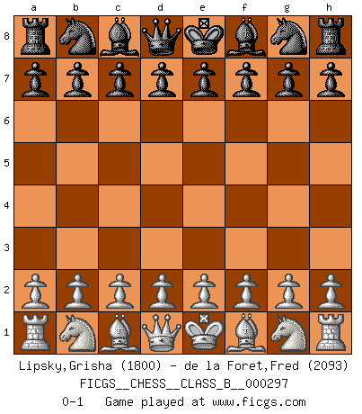 Last move : 0-1 2019 February 22 9:3:30 [Event "FICGS__CHESS__CLASS_B__000297"] [Site "FICGS"] [Date "2019.01.12"] [Round "1"] [White "Lipsky,Grisha"] [Black "de la Foret,Fred"] [Result "0-1"] [WhiteElo "1800"] [BlackElo "2093"] 0-1 This chess game has been lost on time (started : 2019.01.12 21:34:37) Player Black won this chess game. Follow this game move after move (download)Chess is life. (Bobby Fischer) Glücklicherweise sind Großmeister Ruben Fines reine Schachbücher weniger phallozentrisch [als seine Schachpsychologie] und deswegen auch weniger lächerlich. (Nigel Short) El Ajedrez era la lengua materna de Capablanca. (Reti) Shah mat. Le roi est mort. Cri de fierté d'un joueur venant de terrasser son adversaire, courtoisement, sans effusion de sang. Beep ! (R2D2 in Star Wars ep.3)