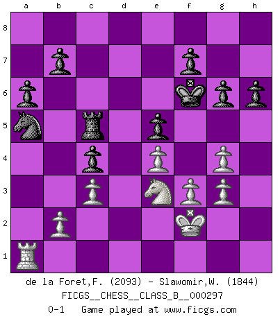 Last move : 0-1 2019 July 15 16:23:43 [Event "FICGS__CHESS__CLASS_B__000297"] [Site "FICGS"] [Date "2019.01.12"] [Round "1"] [White "de la Foret,Fred"] [Black "Slawomir,Weglicki"] [Result "0-1"] [WhiteElo "2093"] [BlackElo "1844"] 1.e4 c5 2.Nf3 d6 3.d4 cxd4 4.Nxd4 Nf6 5.Nc3 a6 6.Be2 e5 7.Nb3 Be7 8.O-O O-O 9.Be3 Be6 10.Qd2 Nbd7 11.a4 Rc8 12.a5 Qc7 13.Bf3 h6 14.Rfc1 Nc5 15.Nxc5 dxc5 16.Na4 c4 17.Qc3 Nd7 18.h3 Qc6 19.Rd1 Qb5 20.Qe1 Nf6 21.Bb6 Bb4 22.Nc3 Qc6 23.Qe2 Rfe8 24.Qe1 Nd7 25.Ba7 Ra8 26.Be3 Rad8 27.Bd2 Bf8 28.Na4 Qb5 29.Nc3 Qc6 30.Be3 Nf6 31.Bb6 Rd6 32.Rdc1 Rd7 33.Qe3 Bb4 34.Rab1 Rc8 35.Ra1 Kh7 36.Rcb1 g6 37.Qe1 Kg7 38.Rc1 Rd4 39.Rd1 Rxd1 40.Qxd1 Bc5 41.Na4 Bxb6 42.Nxb6 Rc7 43.Qd8 Nd7 44.Nd5 Rc8 45.Qe7 Qc5 46.Qxc5 Rxc5 47.Ne3 Nb8 48.Bg4 Bxg4 49.hxg4 Nc6 50.Ra4 Nxa5 51.f3 Kf6 52.Kf2 Kg5 53.Ra1 Nc6 54.c3 Na5 55.g3 Kf6 0-1 Sicilian : Najdorf, Opovcensky variation Kingside Castling by player White (move 8) Kingside Castling by player Black (move 8) Player Black won this chess game. Follow this game move after move (download)In life, as in Chess, one's own Pawns block one's way. A man's very wealth, ease, leisure, children, books, which should help him to win, more often checkmate him. (Charles Buxton) Wenn Du nicht kämpfst, um anderen etwas zu beweisen, sondern nur für Dich selbst, dann bist du fast unbesiegbar. (Garry Kasparov) El pensamiento metódico es mas útil en el Ajedrez que la inspiración. (C. J. S. Purdy) Tous ces prétendus hommes politiques sont les pions, les Cavaliers, les Tours ou les Fous d'une partie d'échecs qui se jouera tant qu'un hasard ne renversera pas l'échiquier. (Honoré de Balzac) Two beer, or not two beer. (Unknown)