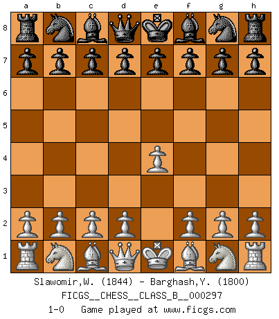 Last move : 1-0 2019 February 22 9:3:30 [Event "FICGS__CHESS__CLASS_B__000297"] [Site "FICGS"] [Date "2019.01.12"] [Round "1"] [White "Slawomir,Weglicki"] [Black "Barghash,Yahya"] [Result "1-0"] [WhiteElo "1844"] [BlackElo "1800"] 1.e4 1-0 This chess game has been lost on time (started : 2019.01.12 21:34:37) King's pawn Opening Player White won this chess game. Follow this game move after move (download)Any material change in a position must come about by mate, a capture, or a Pawn promotion. (Purdy) Wie ich sie so einen nach dem anderen nieder mähte wurde meine Überlegenheit offensichtlich. (José Raúl Capablanca) El Ajedrez es una hermosa aventura. (Bent Larsen) Aux échecs, les retours au sommet sont rares : les dommages psychologiques consécutifs à une défaite sont trop sévères. (Daily Telegraph) The leaves of memory seemed to make a mournful rustling in the dark. (Henry Wadsworth Longfellow)