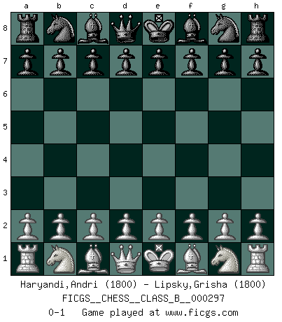 Last move : 0-1 2019 February 22 9:3:30 [Event "FICGS__CHESS__CLASS_B__000297"] [Site "FICGS"] [Date "2019.01.12"] [Round "1"] [White "Haryandi,Andri"] [Black "Lipsky,Grisha"] [Result "0-1"] [WhiteElo "1800"] [BlackElo "1800"] 0-1 This chess game has been lost on time (started : 2019.01.12 21:34:37) Player Black won this chess game. Follow this game move after move (download)Any material change in a position must come about by mate, a capture, or a Pawn promotion. (Purdy) Die jungen Leute sollen verstehen, dass sie noch etwas von mir lernen können und müssen. (Viktor Kortschnoi) Una partida de Ajedrez se divide en 3 etapas: la primera cuando piensas que tienes la ventaja, la segunda cuando crees que tienes la ventaja y la tercera... ¡cuando te das cuenta que vas a perder!. (Savielly Tartakower) Dans le domaine de la peinture, de la gravure et de la sculpture, dès la première décennie de notre siècle, les artistes abandonnent la représentation de la partie d'échecs pour se concentrer sur les pièces, sur les échiquiers et sur toutes les variations auxquelles les unes et les autres peuvent donner lieu. On passe en quelque sorte d'un thème social à un thème musical (au sens de la musica médiévale, c'est-à-dire d'une notion qui inclue le rythme, l'harmonie, la construction et la déconstruction, etc.). Graphiquement et picturalement, l'échiquier apparaît comme une structure ouverte, dynamique, d'une richesse infinie, autorisant toutes les combinatoires et débouchant sur des mouvements et des rythmes de nature exponentielle. (Michel Pastoureau) Quotation,n.: The act of repeating erroneously the words of another. The words erroneously repeated. (Ambrose Bierce, The Devil's Dictionary)