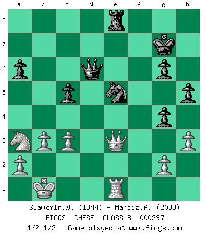 Last move : 1/2-1/2 2019 January 24 17:51:4 [Event "FICGS__CHESS__CLASS_B__000297"] [Site "FICGS"] [Date "2019.01.12"] [Round "1"] [White "Slawomir,Weglicki"] [Black "Marciz,Alexander"] [Result "1/2-1/2"] [WhiteElo "1844"] [BlackElo "2033"] 1.e4 d6 2.d4 Nf6 3.Nc3 g6 4.f4 Bg7 5.Nf3 O-O 6.Bd3 Nc6 7.e5 dxe5 8.fxe5 Nh5 9.Be3 Bg4 10.Be2 f6 11.exf6 exf6 12.d5 Qe7 13.Qd2 Ne5 14.O-O-O Rfe8 15.Nd4 c6 16.Rhe1 f5 17.dxc6 bxc6 18.Bxg4 fxg4 19.Bh6 Qb7 20.b3 Bxh6 21.Qxh6 Qb4 22.Ne4 Rad8 23.c3 Qe7 24.Qe3 Nf6 25.Kb1 c5 26.Nb5 Nxe4 27.Qxe4 a6 28.Na3 Rxd1+ 29.Rxd1 Kg7 30.Qe3 h5 31.Re1 Qd6 32.h3 1/2-1/2 Pirc : Austrian attack, 6.Bd3 Kingside Castling by player Black (move 5) Queenside Castling by player White (move 14) This chess game ended in a draw. Follow this game move after move (download)Chess books should be used as we use glasses: to assist the sight, although some players make use of them as if they thought they conferred sight. (Jose Raul Capablanca) Wenn sie aufgeben, dann danke ich Ihnen für das Spiel (Eventualzug beim Fernschach). (Anonymous) Siempre es mucho mejor sacrificar las piezas de tu oponente. (Savielly Tartakover) Les échecs sont plus proches de l'art de l'assassinat que de l'art de la guerre. (Arturo Perez-Reverte) All men can see these tactics whereby I conquer, but what none can see is the strategy out of which victory is evolved. (Sun Tzu)