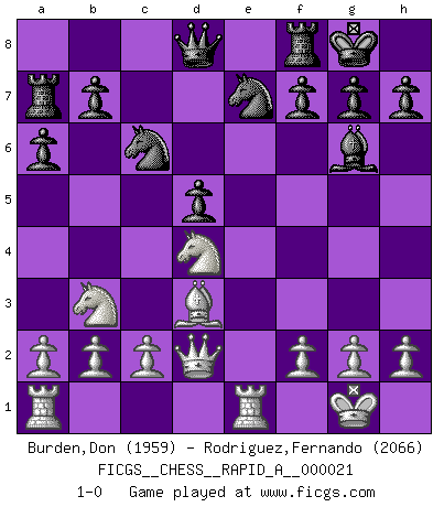 Last move : 1-0 2007 June 29 13:29:33 [Event "FICGS__CHESS__RAPID_A__000021"] [Site "FICGS"] [Date "2007.05.31"] [Round "1"] [White "Burden,Don"] [Black "Rodriguez,Fernando"] [Result "1-0"] [WhiteElo "1959"] [BlackElo "2066"] 1.e4 e6 2.d4 d5 3.Nd2 a6 4.Ngf3 c5 5.exd5 exd5 6.dxc5 Bxc5 7.Nb3 Ba7 8.Qe2+ Ne7 9.Be3 O-O 10.Bxa7 Rxa7 11.Qd2 Nbc6 12.Bd3 Bg4 13.Nfd4 Bh5 14.O-O Bg6 15.Rfe1 1-0 French : Tarrasch Kingside Castling by player Black (move 9) Kingside Castling by player White (move 14) Player White won this chess game. Follow this game move after move (download)Chess is no whit inferior to the violin, and we have a large number of professional violinists. (Mikhail Botvinnik) Alles was am Schachbrett zählt sind gute Züge. (Robert James Fischer) Dios mío, Bobby Fischer juega tan simple. (Alexei Suetin) Les Echecs mettent en conflit, non pas deux intelligences, mais deux volontés. (Lasker) See no evil, hear no evil, speak no evil. (The 3 monkeys)