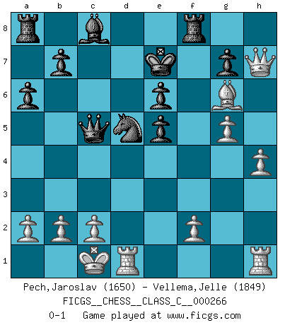 Last move : 0-1 2019 June 5 8:39:45 [Event "FICGS__CHESS__CLASS_C__000266"] [Site "FICGS"] [Date "2019.01.13"] [Round "1"] [White "Pech,Jaroslav"] [Black "Vellema,Jelle"] [Result "0-1"] [WhiteElo "1650"] [BlackElo "1849"] 1.e4 e6 2.d4 d5 3.Nc3 dxe4 4.Nxe4 Nd7 5.Nf3 Ngf6 6.Nxf6+ Nxf6 7.Bd3 c5 8.Be3 Qc7 9.Qe2 Be7 10.dxc5 Bxc5 11.Bxc5 Qxc5 12.Ne5 O-O 13.O-O-O a6 14.g4 Nd5 15.h4 f6 16.Qe4 fxe5 17.Qxh7+ Kf7 18.Bg6+ Kf6 19.g5+ Ke7 0-1 French : Rubinstein variation Kingside Castling by player Black (move 12) Queenside Castling by player White (move 13) Player Black won this chess game. Follow this game move after move (download)When asked, -How is that you pick better moves than your opponents?, I responded: I'm very glad you asked me that, because, as it happens, there is a very simple answer. I think up my own moves, and I make my opponent think up his. (Alexander Alekhine) Schach ist gnadenlos. Du mußt bereit sein zu töten. (Nigel Short) El Ajedrez es en su esencia, un juego. En su forma, un arte. Y en su ejecución, una ciencia. (Baron Tassilo) Les pièces de l'échiquier étaient impitoyables. Elles le retenaient, elles l'absorbaient. Il y avait de l'horreur en cela, mais aussi une harmonie unique. Car, qu'y a-t-il dans le monde, à part les échecs ? (V. Nabokov) If everyone is thinking alike, then somebody isn't thinking. (US General George S. Patton)
