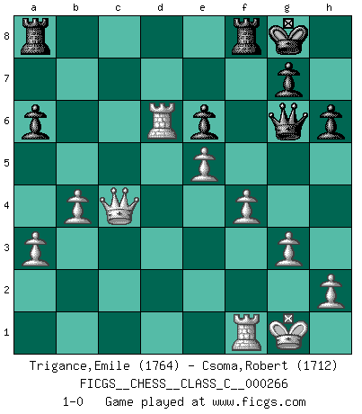 Last move : 1-0 2019 February 26 9:51:37 [Event "FICGS__CHESS__CLASS_C__000266"] [Site "FICGS"] [Date "2019.01.13"] [Round "1"] [White "Trigance,Emile"] [Black "Csoma,Robert"] [Result "1-0"] [WhiteElo "1764"] [BlackElo "1712"] 1.d4 f5 2.c4 Nf6 3.g3 d5 4.cxd5 Qxd5 5.Nf3 e6 6.Bg2 Nc6 7.Nc3 Qd8 8.Bg5 Be7 9.O-O O-O 10.Qd2 Bd7 11.Rfe1 h6 12.Bf4 Ne4 13.Nxe4 fxe4 14.Ne5 Nxe5 15.Bxe5 Bc6 16.a3 Bf6 17.Qc3 Bxe5 18.dxe5 Qg5 19.Rf1 Rf5 20.f4 exf3 21.exf3 Rd8 22.f4 Qe7 23.Bxc6 bxc6 24.Rad1 R5f8 25.Qxc6 Rb8 26.Rd7 Qe8 27.Qxc7 Qg6 28.b4 a6 29.Qc4 Ra8 30.Rd6 1-0 Dutch with c4 & g3 Kingside Castling by player White (move 9) Kingside Castling by player Black (move 9) Player White won this chess game. Follow this game move after move (download)First-class players lose to second class players because second-class players sometimes play a first-class game. (Tarrasch) Frage: Wie viele Autos haben Sie schon zerstört? - Antwort: Nur zwei. (Loek van Wely) Repentinamente, me resultaba obvio en mi analisis que yo había pasado por alto lo que Fischer había visto en el tablero con la mas grande facilidad. (Mikhail Botvinnik) Les Echecs sont affaire de jugement sensible. Savoir quand frapper et quand esquiver. (Fischer) If only people were all showed a certain minimum level of niceness; if only people didn't retract verbal draw offers (without draw box ticked) on ficgs; if only people didn't kill; if only people didn't run concentration / extermination camps, if only people didn't drop nuclear bombs on Hiroshima and Nagasaki, and so on - it would be a much more beautiful world. But sadly, things are not so... (Normajean Yates)