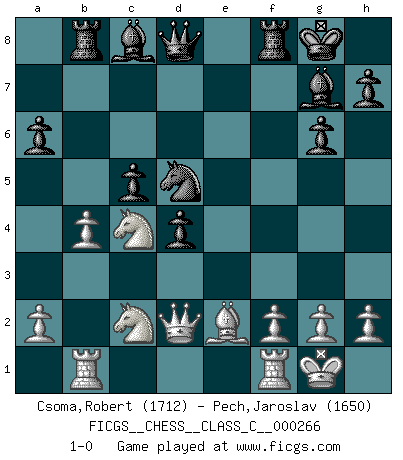 Last move : 1-0 2019 June 12 0:4:21 [Event "FICGS__CHESS__CLASS_C__000266"] [Site "FICGS"] [Date "2019.01.13"] [Round "1"] [White "Csoma,Robert"] [Black "Pech,Jaroslav"] [Result "1-0"] [WhiteElo "1712"] [BlackElo "1650"] 1.c4 e5 2.Nc3 Nc6 3.d3 g6 4.Nf3 Bg7 5.e4 d6 6.Be2 Nge7 7.O-O O-O 8.Be3 Nd4 9.Bxd4 exd4 10.Nb5 c5 11.Nd2 a6 12.Na3 f5 13.Nc2 Rb8 14.b4 b5 15.Rb1 bxc4 16.Nxc4 fxe4 17.dxe4 d5 18.exd5 Nxd5 19.Qd2 1-0 This chess game has been lost on time (started : 2019.01.13 11:30:26) English : Sicilian Reversed Kingside Castling by player White (move 7) Kingside Castling by player Black (move 7) Player White won this chess game. Follow this game move after move (download)Fischer wanted to give the Russians a taste of their own medicine. (Larry Evans) Man braucht nicht immer den besten Zug zu spielen: Ein Zug muß aktiv, unternehmungslustig, korrekt und schön sein. (David Bronstein) Una partida de Ajedrez se divide en 3 etapas: la primera cuando piensas que tienes la ventaja, la segunda cuando crees que tienes la ventaja y la tercera... ¡cuando te das cuenta que vas a perder!. (Savielly Tartakower) Toutes les manuvres exécutées sur une colonne ouverte ont pour but ultime l'intrusion définitive sur la septième ou la huitième rangée, en plein cur de la position ennemie. (Aaron Nimzovitch) If you ain't just a little scared when you enter a casino, you are either very rich or you haven't studied the games enough. (Pappy)