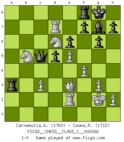 Last move : 1-0 2019 March 7 10:0:9 [Event "FICGS__CHESS__CLASS_C__000266"] [Site "FICGS"] [Date "2019.01.13"] [Round "1"] [White "Carnemolla,Giampaolo"] [Black "Csoma,Robert"] [Result "1-0"] [WhiteElo "1760"] [BlackElo "1712"] 1.e4 c5 2.Nf3 d6 3.d4 cxd4 4.Nxd4 Nf6 5.Nc3 g6 6.Bc4 Bg7 7.Be3 Bd7 8.f3 Nc6 9.O-O O-O 10.Qd2 Ne5 11.Bb5 Bxb5 12.Ndxb5 Nc4 13.Qe2 Nxe3 14.Qxe3 a6 15.Nd4 Rc8 16.Rad1 Qc7 17.Rfe1 b5 18.a3 Qc4 19.g3 b4 20.axb4 Qxb4 21.Nb3 a5 22.Ra1 e6 23.Rxa5 d5 24.Ra4 Qb7 25.e5 Nd7 26.Ra7 Qc6 27.Nd4 Qb6 28.Rxd7 Qxb2 29.Ncb5 Rb8 30.Nd6 Rb4 31.c3 Ra4 32.Re2 Qb6 33.f4 Ra3 34.Kg2 Qc5 35.N4b5 1-0 Sicilian : Dragon variation Kingside Castling by player White (move 9) Kingside Castling by player Black (move 9) Player White won this chess game. Follow this game move after move (download)Chess is a forcing house where the fruits of character can ripen more fully than in life. (Edward Morgan Foster) Deine Wertungszahl - vorausgesetzt einige Jahre schachliche Anstrengung - entspricht etwa dem zehnfachen Deines IQ plus 1000. (Jonathan Levitt) ¿Porque tengo que perder ante este idiota?. (Aron Nimzovich) Il n'y a pas de prix trop élevé au scalp de l'ennemi. (Koblentz) Everybody lies. (Gregory House, House M.D.)