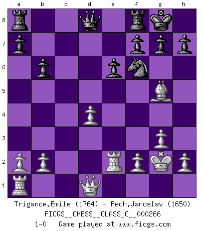 Last move : 1-0 2019 May 18 21:13:7 [Event "FICGS__CHESS__CLASS_C__000266"] [Site "FICGS"] [Date "2019.01.13"] [Round "1"] [White "Trigance,Emile"] [Black "Pech,Jaroslav"] [Result "1-0"] [WhiteElo "1764"] [BlackElo "1650"] 1.d4 d5 2.Nc3 Nf6 3.Nf3 Nbd7 4.g3 e6 5.Bg2 Bb4 6.Bd2 Be7 7.O-O O-O 8.Re1 c5 9.e3 b6 10.e4 dxe4 11.Nxe4 Nxe4 12.Rxe4 Bf6 13.c3 Bb7 14.Re2 cxd4 15.Nxd4 Bxg2 16.Kxg2 Bxd4 17.cxd4 Nf6 18.Bg5 1-0 This chess game has been lost on time (started : 2019.01.13 11:30:26) Queen's pawn : Chigorin variation Kingside Castling by player White (move 7) Kingside Castling by player Black (move 7) Player White won this chess game. Follow this game move after move (download)All my games are real. (Bobby Fischer) Die Leute spielen gegen mich seit 15 Jahren unter Ihren Möglichkeiten. (Robert James Fischer) El Ajedrez es una guerra en un tablero. El objetivo es aplastar la mente del oponente. (Bobby Fischer) Nous sommes les pions de la mystérieuse partie d'Echecs jouée par Dieu. Il nous déplace, nous arrête, nous pousse encore, puis nous lance un à un dans la boîte du Néant. Epitaphe sur la tombe de David Janowsky (1868-1927). Computers make it easier to do a lot of things, but most of the things they make it easier to do don't need to be done. (Andy Rooney)