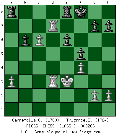 Last move : 1-0 2019 February 19 9:53:12 [Event "FICGS__CHESS__CLASS_C__000266"] [Site "FICGS"] [Date "2019.01.13"] [Round "1"] [White "Carnemolla,Giampaolo"] [Black "Trigance,Emile"] [Result "1-0"] [WhiteElo "1760"] [BlackElo "1764"] 1.d4 Nf6 2.c4 e6 3.Nc3 Bb4 4.a3 Bxc3+ 5.bxc3 c5 6.e4 Qa5 7.e5 Ne4 8.Bd2 Nc6 9.Nf3 cxd4 10.cxd4 Nxd2 11.Qxd2 Qxd2+ 12.Kxd2 b6 13.Bd3 Bb7 14.Be4 Na5 15.Bxb7 Nxb7 16.Rab1 d6 17.Rhc1 Rc8 18.exd6 Nxd6 19.c5 bxc5 20.dxc5 Ne4+ 21.Ke3 f5 22.Rb7 O-O 23.c6 Ra8 24.Ne5 Nd6 25.Rd7 Nc8 26.f4 Re8 27.Nc4 Nb6 28.Nxb6 axb6 29.Rc3 Kf8 30.Rcd3 1-0 Nimzo-Indian : Saemisch variation Kingside Castling by player Black (move 22) Player White won this chess game. Follow this game move after move (download)Chess is as much a mystery as women. (Purdy) Ein guter Spieler hat immer Glück. (José Raúl Capablanca) El Ajedrez es una hermosa aventura. (Bent Larsen) On a dit que l'homme se distingue de l'animal par le fait qu'il achète plus de livres qu'il ne peut en lire. Je voudrais suggérer qu'inclure à la liste des livres quelques livres d'échecs rendrait la distinction manifeste. (Edward Lasker) Begin at the beginning and go on till you come to the end; then stop. (Lewis Carrol, Alice in Wonderland)