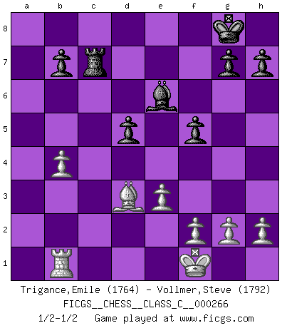 Last move : 1/2-1/2 2019 January 30 0:46:58 [Event "FICGS__CHESS__CLASS_C__000266"] [Site "FICGS"] [Date "2019.01.13"] [Round "1"] [White "Trigance,Emile"] [Black "Vollmer,Steve"] [Result "1/2-1/2"] [WhiteElo "1764"] [BlackElo "1792"] 1.d4 Nf6 2.c4 e6 3.Nf3 d5 4.Nc3 Be7 5.Bf4 O-O 6.e3 Nbd7 7.cxd5 Nxd5 8.Nxd5 exd5 9.Bd3 c6 10.O-O f5 11.Ne5 Qb6 12.Qc2 Nxe5 13.Bxe5 Be6 14.a3 a5 15.Rab1 c5 16.dxc5 Bxc5 17.Qe2 Rae8 18.b4 axb4 19.axb4 Bd6 20.Bd4 Qc7 21.Rfc1 Qe7 22.Bc5 Rc8 23.Bxd6 Qxd6 24.Qb2 Rfd8 25.Qd4 Rc7 26.Rxc7 Qxc7 27.Qc5 Rc8 28.Qxc7 Rxc7 29.Kf1 1/2-1/2 Queen's pawn game Kingside Castling by player Black (move 5) Kingside Castling by player White (move 10) This chess game ended in a draw. Follow this game move after move (download)When you are lonely, when you feel yourself an alien in the world, play Chess. This will raise your spirits and be your counselor in war. (Aristotle) Oft bringt ein stiller Zug das Erdbeben. (Richard Reti) Dios mío, Bobby Fischer juega tan simple. (Alexei Suetin) Plusieurs personnes se sont demandées comment Tal faisait pour gagner... En fait, c'est très simple ! Il met ses pièces au centre de l'échiquier et les sacrifie quelque part ! (David Bronstein) As the days dwindle down... to a precious few. (Maxwell Anderson)