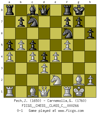 Last move : 0-1 2019 June 19 2:20:57 [Event "FICGS__CHESS__CLASS_C__000266"] [Site "FICGS"] [Date "2019.01.13"] [Round "1"] [White "Pech,Jaroslav"] [Black "Carnemolla,Giampaolo"] [Result "0-1"] [WhiteElo "1650"] [BlackElo "1760"] 1.c4 Nf6 2.Nc3 e5 3.Nf3 Nc6 4.g3 Bc5 5.Bg2 O-O 6.O-O d6 7.d3 h6 8.a3 a6 9.b4 Bd4 10.Nxd4 Nxd4 11.e3 Ne6 12.f4 exf4 13.gxf4 c6 14.f5 Nc7 15.a4 d5 16.e4 a5 17.b5 d4 18.Ne2 c5 0-1 This chess game has been lost on time (started : 2019.01.13 11:30:26) English Opening Kingside Castling by player Black (move 5) Kingside Castling by player White (move 6) Player Black won this chess game. Follow this game move after move (download)No other master has such a terrific will to win. At the board he radiates danger, and even the strongest opponents tend to freeze, like rabbits when they smell a panther. Even his weaknesses are dangerous. As white, his opening game is predictable - you can make plans against it - but so strong that your plans almost never work. In the middle game his precision and invention are fabulous, and in the end game you simply cannot beat him. (Anonymous German Expert) Sitze auf Deine Hände. (Siegbert Tarrasch) Los Peones son nacidos libres, y aún así, se encuentran por doquier encadenados. (Rick Kennedy) Les échecs sont un jeu terrible. Si vous n'avez pas le centre, votre adversaire a une position plus libre. Par contre, si vous avez le centre, alors vous avez vraiment quelque chose pour laquelle vous inquiéter ! (Siegbert Tarrasch) You think that education is too expensive ? Try ignorance. (Derek Bok)