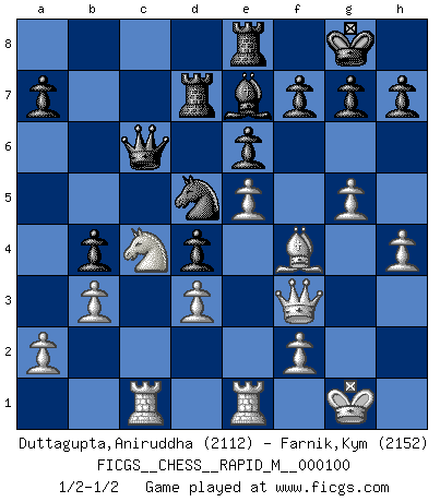 Last move : 1/2-1/2 2019 March 25 9:37:55 [Event "FICGS__CHESS__RAPID_M__000100"] [Site "FICGS"] [Date "2019.01.14"] [Round "1"] [White "Duttagupta,Aniruddha"] [Black "Farnik,Kym"] [Result "1/2-1/2"] [WhiteElo "2112"] [BlackElo "2152"] 1.Nf3 d5 2.g3 Nf6 3.Bg2 c5 4.O-O e6 5.d3 Nc6 6.Nbd2 Be7 7.e4 O-O 8.Re1 Re8 9.e5 Nd7 10.Qe2 b5 11.h4 Bb7 12.Nf1 Qc7 13.Bf4 Rac8 14.c3 b4 15.Ne3 Bf8 16.c4 Nd4 17.Qd1 dxc4 18.Nxc4 Qc6 19.Re3 Ba8 20.Ne1 Qa6 21.Bxa8 Rxa8 22.Nf3 Nb6 23.Nxd4 cxd4 24.Re4 Rad8 25.b3 Nd5 26.Re1 Bc5 27.Qf3 Rd7 28.g4 Be7 29.g5 Qc6 30.Rac1 1/2-1/2 Reti : King's Indian attack (Barcza system) Kingside Castling by player White (move 4) Kingside Castling by player Black (move 7) This chess game ended in a draw. Follow this game move after move (download)I prefer to lose a really good game than to win a bad one. (David Levy) Die Fehler sind da, Sie warten nur darauf gemacht zu werden. (Savielly Grigorievitsch Tartakower) El jugador táctico debe saber que hacer cuando algo se debe de hacer. El estratégico debe saber que hacer cuando nada se debe de hacer. (Savielly Tartakover) Les Echecs sont affaire de jugement sensible. Savoir quand frapper et quand esquiver. (Fischer) All the biggest technological inventions created by man - the airplane, the automobile, the computer - says little about his intelligence, but speaks volumes about his laziness. (Mark Kennedy)