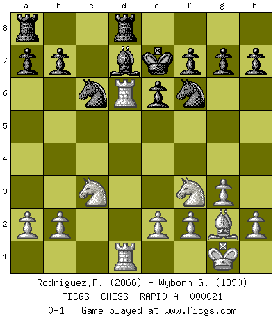 Last move : 0-1 2007 July 29 7:17:55 [Event "FICGS__CHESS__RAPID_A__000021"] [Site "FICGS"] [Date "2007.05.31"] [Round "1"] [White "Rodriguez,Fernando"] [Black "Wyborn,Graham"] [Result "0-1"] [WhiteElo "2066"] [BlackElo "1890"] 1.d4 d5 2.c4 e6 3.Nf3 Nf6 4.g3 Be7 5.Bg2 O-O 6.O-O c5 7.Nc3 dxc4 8.dxc5 Nc6 9.Qa4 Qa5 10.Qxc4 Qxc5 11.Qxc5 Bxc5 12.Bf4 Rd8 13.Rfd1 Bd7 14.Bd6 Bxd6 15.Rxd6 Kf8 16.Rad1 Ke7 0-1 This chess game has been lost on time (started : 2007.05.31 6:16:54) Queen's gambit declined Kingside Castling by player Black (move 5) Kingside Castling by player White (move 6) Player Black won this chess game. Follow this game move after move (download)Play the opening like a book, the middle game like a magician, and the endgame like a machine. (Spielmann) Alle Schachspieler sollten auch ein Hobby haben. (Savielly Grigorievitsch Tartakower) Cuando me preguntan: -¿Cual es el secreto que te hace hacer mejores movidas que tus oponentes?, Yo respondo: Me da gusto que me pregunten eso, porque, como veran, hay una simple razón. Yo pienso mis propias movidas y dejo a mi oponente que el piense las suyas. (Alexander Alekhine) Mon pion favori sur ma case favorite ! Bronstein en parlant d'un coup de pion en h5 quand il avait les Noirs. That's absurd. I love it. (Gregory House, House M.D.)