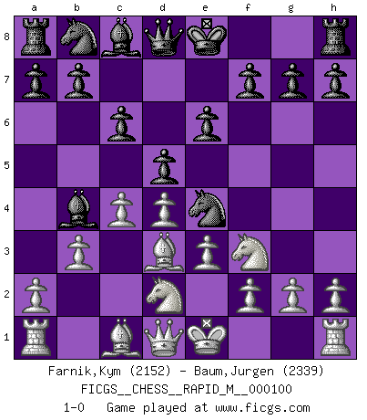 Last move : 1-0 2019 February 26 21:43:2 [Event "FICGS__CHESS__RAPID_M__000100"] [Site "FICGS"] [Date "2019.01.14"] [Round "1"] [White "Farnik,Kym"] [Black "Baum,Jurgen"] [Result "1-0"] [WhiteElo "2152"] [BlackElo "2339"] 1.Nf3 d5 2.d4 Nf6 3.c4 c6 4.e3 e6 5.b3 Ne4 6.Bd3 Bb4+ 7.Nbd2 1-0 This chess game has been lost on time (started : 2019.01.14 21:11:52) Reti Opening Player White won this chess game. Follow this game move after move (download)Winning isn't everything... but losing is nothing. (Mednis) Ich habe Kasparov in Rente geschickt. (Veselin Topalov) La belleza de un movimiento no se refleja solo en su apariencia, sino en el pensamiento detrás de él. (Siegbert Tarrasch) Il (Jacob Murray) ne joue pas pour le bon coup, mais pour le meilleur. (Eloi Relange) To be champion requires more than simply being a strong player; one has to be a strong human being as well. (Anatoly Karpov)