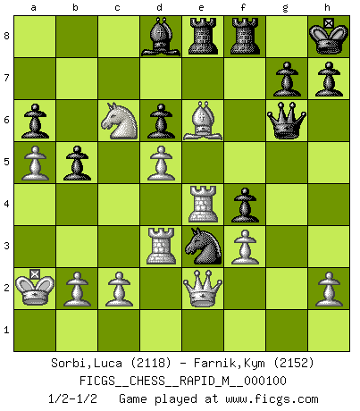 Last move : 1/2-1/2 2019 February 16 3:11:32 [Event "FICGS__CHESS__RAPID_M__000100"] [Site "FICGS"] [Date "2019.01.14"] [Round "1"] [White "Sorbi,Luca"] [Black "Farnik,Kym"] [Result "1/2-1/2"] [WhiteElo "2118"] [BlackElo "2152"] 1.e4 c5 2.Nf3 d6 3.d4 cxd4 4.Nxd4 Nf6 5.Nc3 a6 6.Be3 e5 7.Nb3 Be6 8.f3 Be7 9.Qd2 Nbd7 10.g4 O-O 11.O-O-O b5 12.g5 Nh5 13.Nd5 Bxd5 14.exd5 f6 15.gxf6 Bxf6 16.Na5 Qe8 17.Bh3 Nf4 18.Bxf4 exf4 19.Rhe1 Ne5 20.Re4 Kh8 21.Qe2 Qg6 22.Kb1 Bd8 23.Nc6 Nc4 24.Be6 Bb6 25.a4 Rae8 26.Ka2 Ne3 27.a5 Bd8 28.Rd3 1/2-1/2 Sicilian : Najdorf, Byrne (English) attack Kingside Castling by player Black (move 10) Queenside Castling by player White (move 11) This chess game ended in a draw. Follow this game move after move (download)In Fischer's hands, a slight theoretical advantage is as good a being a Queen ahead. (Isaac Kashdan) Über die Verhaftung Bobby Fischers: Warum es die Bush-Administration für nötig befindet einen 61 Jahre alten Mann zu hetzten, der für niemanden ausser sich selbste eine Gefahr darstellt ist ein Rätsel. (Nigel Short) En la vida, como en el Ajedrez, los Peones propios obstruyen nuestro camino. La gran fortuna de un hombre, su comodidad, placer, hijos, libros, que deberían ayudarle a ganar, con mucha frecuencia lo ponen en Jaque Mate. (Charles Buxton) Si rien de grave n'est détecté lors de l'analyse d'une position, on joue alors le coup. Seconde règle de Blumenfeld. You must have a dream in order to have it come true. (A.P.J. Kalam)