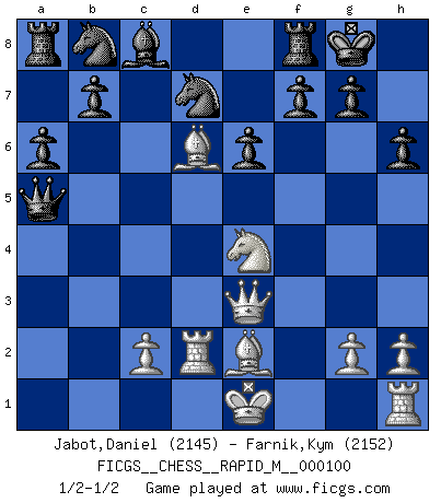 Last move : 1/2-1/2 2019 March 11 8:46:3 [Event "FICGS__CHESS__RAPID_M__000100"] [Site "FICGS"] [Date "2019.01.14"] [Round "1"] [White "Jabot,Daniel"] [Black "Farnik,Kym"] [Result "1/2-1/2"] [WhiteElo "2145"] [BlackElo "2152"] 1.e4 c5 2.Nf3 d6 3.d4 cxd4 4.Nxd4 Nf6 5.Nc3 a6 6.Bg5 e6 7.f4 Qb6 8.Qd2 Qxb2 9.Rb1 Qa3 10.e5 h6 11.Bh4 dxe5 12.fxe5 Nfd7 13.Ne4 Qxa2 14.Rd1 Qd5 15.Qe3 Qxe5 16.Be2 Bc5 17.Bg3 Bxd4 18.Rxd4 Qa5+ 19.Rd2 O-O 20.Bd6 1/2-1/2 Sicilian : Najdorf, 7...Qb6 Kingside Castling by player Black (move 19) This chess game ended in a draw. Follow this game move after move (download)Chess is like life. (Boris Spassky) Als er Schachweltmeister wurde ließ er praktisch alle stärksten Sovietspieler für sich arbeiten. Wenn ein auch nur mittelmässiger Meister ein Spezialist für eine bestimmte Eröffnung war, wurde er von Karpov gerufen. Das wurde alles geheim gehalten. (Mikhail Moiseyevich Botvinik) El hombre es un frívolo, una creatura engañosa y como un jugador de Ajedrez, se preocupa mas por el proceso de obtener su meta que de la meta por sí misma. (Dostoyevsky) J'ai vu le vaincu d'Echecs jouer des années durant dans l'espoir de la fête de la victoire. Car tu es plus riche de ce qu'elle existe si même elle n'est point pour toi. Ainsi de la perle du fond des mers. (Antoine de Saint-Exupéry) Without deviation from the norm, progress is not possible. (Frank Zappa)