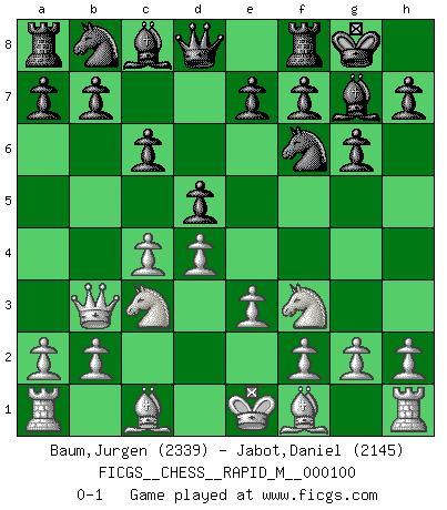 Last move : 0-1 2019 February 26 21:43:2 [Event "FICGS__CHESS__RAPID_M__000100"] [Site "FICGS"] [Date "2019.01.14"] [Round "1"] [White "Baum,Jurgen"] [Black "Jabot,Daniel"] [Result "0-1"] [WhiteElo "2339"] [BlackElo "2145"] 1.d4 d5 2.c4 c6 3.Nc3 Nf6 4.Nf3 g6 5.e3 Bg7 6.Qb3 O-O 0-1 This chess game has been lost on time (started : 2019.01.14 21:11:52) QGD Slav defense Kingside Castling by player Black (move 6) Player Black won this chess game. Follow this game move after move (download)You can only get good at Chess if you love the game. (Bobby Fischer) Im Schach gewinnt jeder. Hat man Freunde am Spiel - und das ist die Hauptsache - ist auch der Verlust einer Partie kein Unglück. (David Bronstein) El Ajedrez, como la música, como el amor, tiene el poder de hacer feliz a la gente. (Siegbert Tarrasch) Comme les marins qui ont mille raisons différentes d'aller en mer, les joueurs d'échecs en ont tout autant avant de s'installer devant une table et jouer... (Vincent Bertignac, philosophe) If we don't succeed, we run the risk of failure. (George W. Bush)